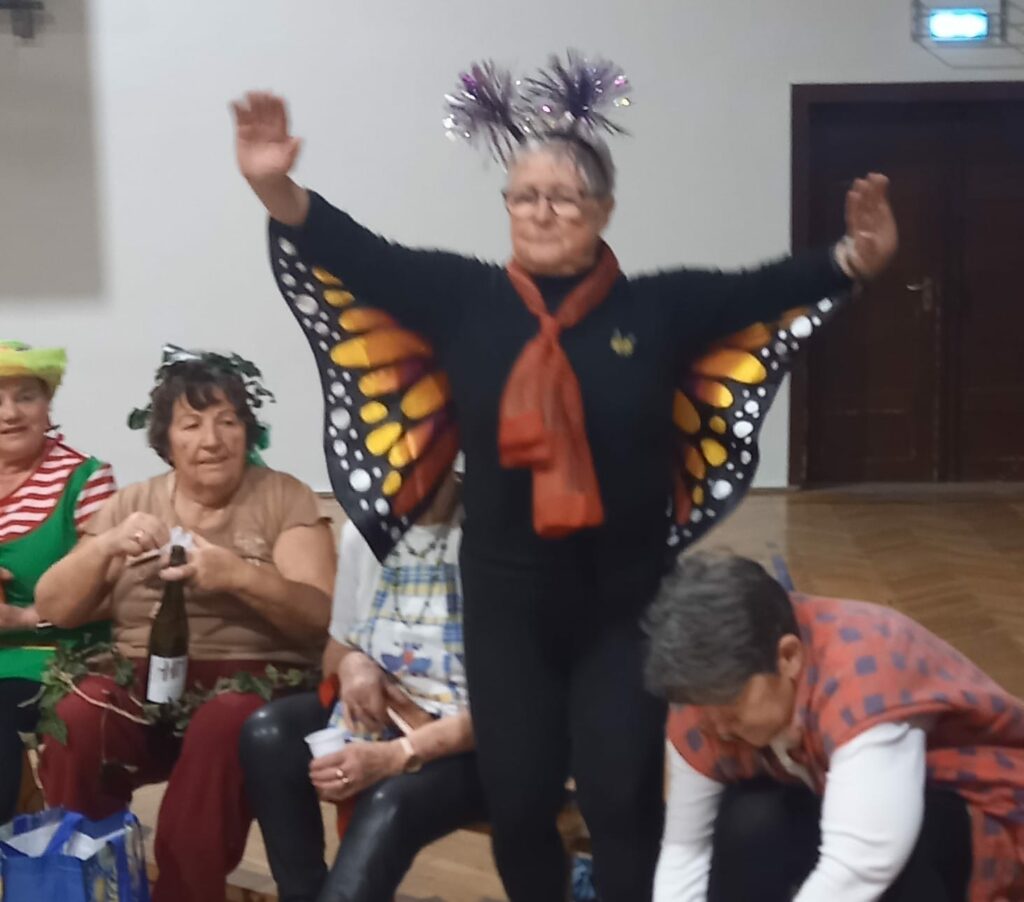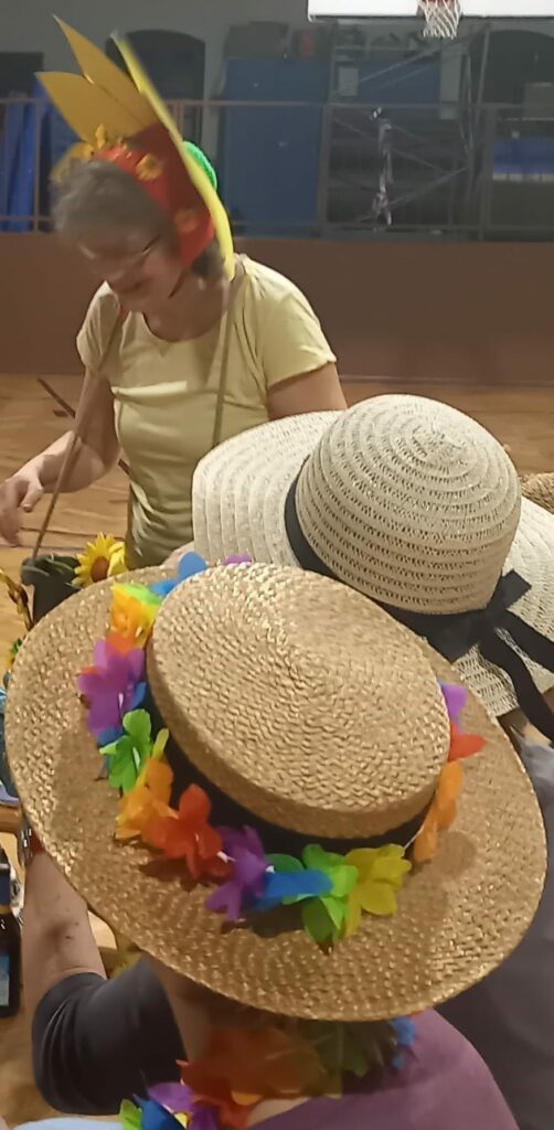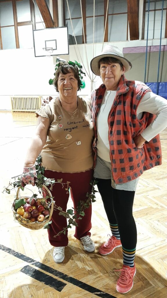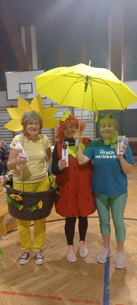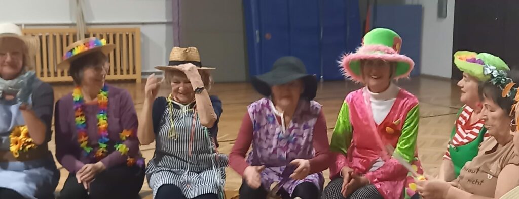 Am Faschingsdienstag haben die beiden Gruppen der Frauengymnastik Dienstag und Donnerstag die Turnhalle kurzerhand in einen „Garten“ umgewandelt. in tollen, farbenfrohen und sehr originellen Kostümen sind alle zum lustigen Treffen erschienen.